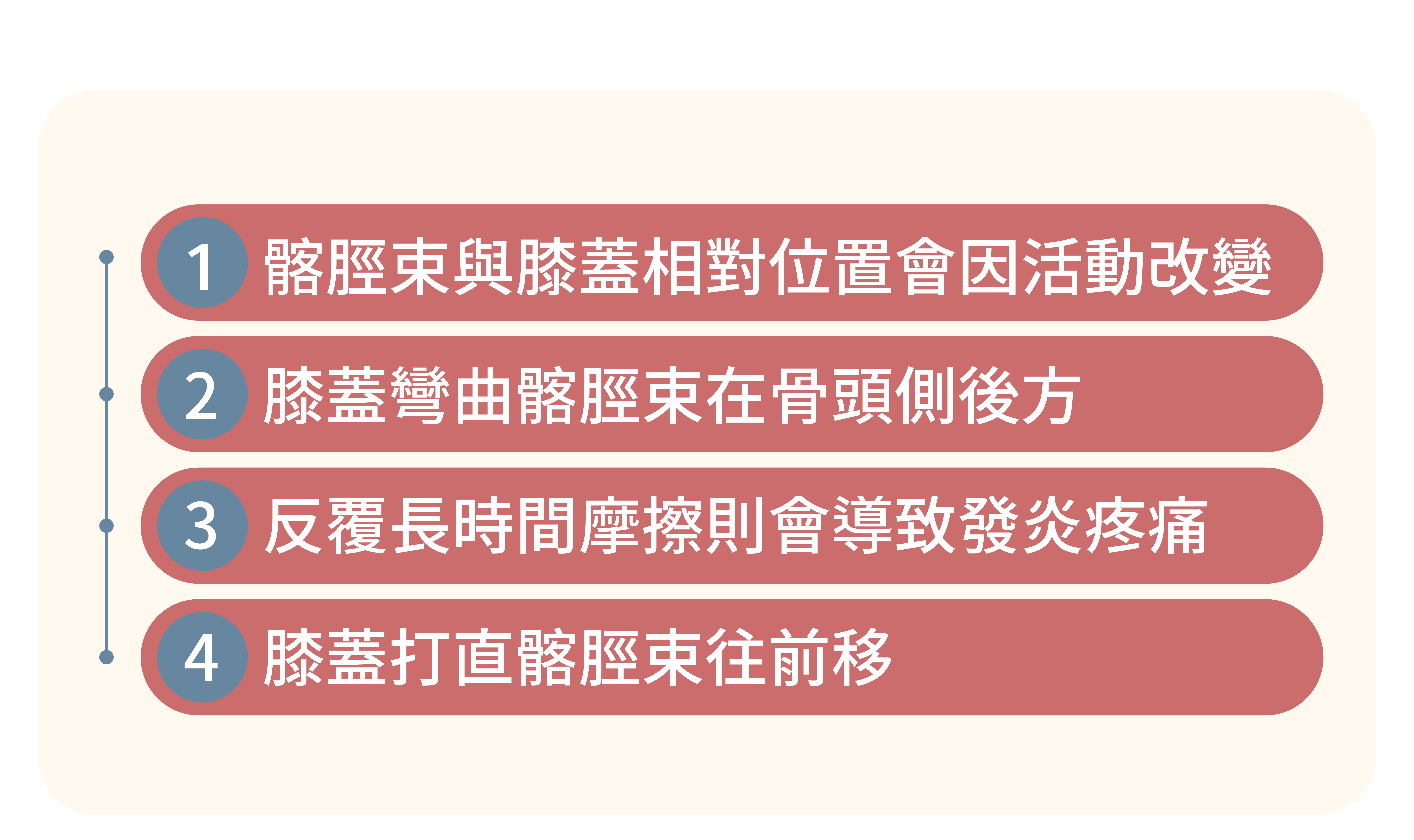 髂脛束是一條又長又粗的韌帶,連接股骨外上髁(大腿)和脛骨(小腿)。隨著膝蓋的彎曲和伸直,髂脛束會向前和向後拉扯。其主要功能包括: